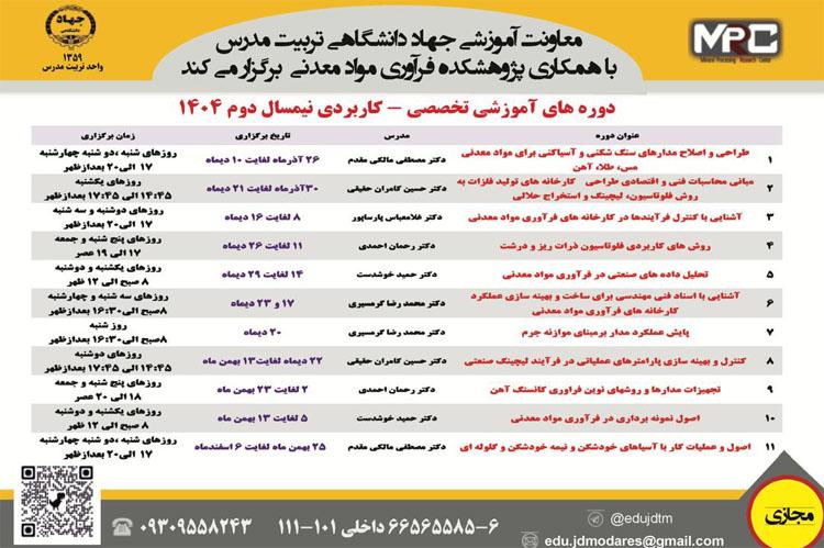 در شرایط کنونی که توسعه پایدار و بهره وری در صنایع معدنی کشور بیش از پیش نیازمند دانش تخصصی و مهارت کاربردی است،آموزش هدفمند و به روز بعنوان یکی از ارکان اصلی ارتقاء کیفیت نیروی انسانی و افزایش راندمان عملیاتی شناخته میشود. تربیت کارشناسانی که علاوه بر دانش نظری ،توانایی تحلیل و اجرای فرآیندهای صنعتی را داشته باشند ضرورتی انکارناپذیر در مسیر پیشرفت و رقابت پذیری سازمانها ... است. در این راستا معاونت آموزشی جهاد دانشگاهی تربیت مدرس با همکاری پژوهشکده فرآوری معدنی این واحد ، با توجه به ارتباطات متعدد با متخصصین این عرصه و بر اساس تقاضا و اعلام نیاز مجموعه ها، در نظر دارد با بهره گیری از اساتید مجرب دانشگاهی و فعالان صنعت اقدام به برگزاری دوره های آموزشی مجازی به نموده تا بنابر رسالت خود گام کوچکی در این زمینه بردارد.