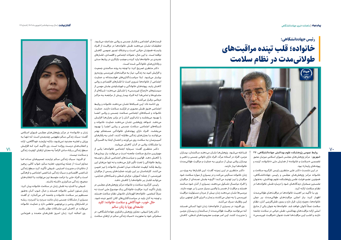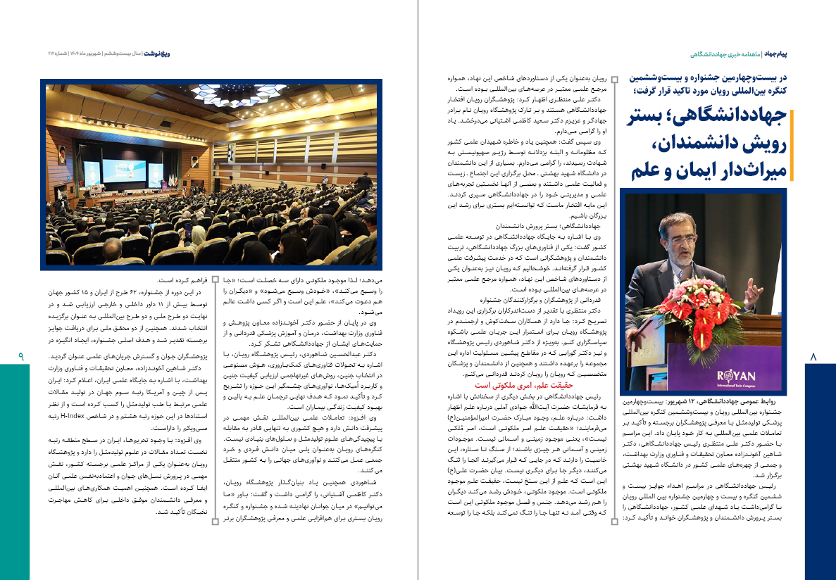 از جمله مطالب این شماره می‌توان به روایت دو دیدار ماندگار رهبر انقلاب با جهادگران جهاددانشگاهی، توسعه همکاری های جهاددانشگاهی با مراکز درمانی عراق،  واگذاری مسئولیت ملی نظارت و پیشبرد برنامه های کلان حوزه انیمیشن و بازی به جهاددانشگاهی، «درخت اجتماعی سلامت»؛ مدلی نوین برای ترسیم ابعاد چندگانه سلامت، تازه‌ترین نتایج نظرسنجی ایسپا درباره مصرف شبکه‌های اجتماعی و استفاده از ابزارهای هوش مصنوعی، تبدیل یافته‌های پژوهشی به محصولات درمانی؛ رویکرد جهاددانشگاهی در پزشکی بازساختی، پرورش دانشجویان و حمایت از جوانان محور فعالیت‌های پارک‌های علم و فناوری جهاددانشگاهی، جهاددانشگاهی به استقبال از دانشجویان جدیدالورود می‌رود، امضای تفاهم‌نامه همکاری جهاددانشگاهی و مرکز مطالعات و همکاری‌های علمی بین‌المللی وزارت علوم، خانواده‌؛ قلب تپنده مراقبت‌های طولانی‌مدت در نظام سلامت و ... اشاره کرد.