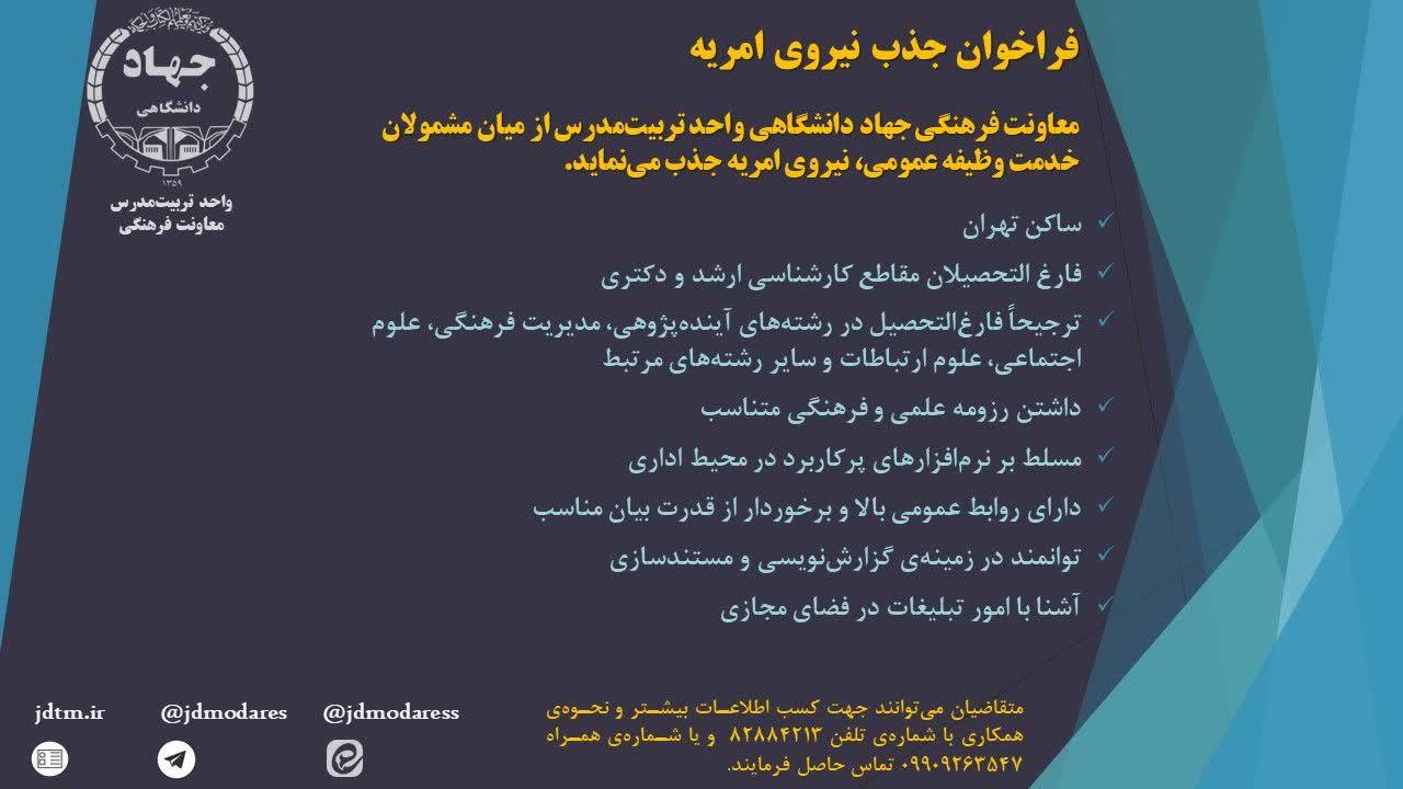 معاونت فرهنگی جهاددانشگاهی تربیت مدرس از میان مشمولان خدمت وظیفه عمومی نیروی امریه جذب می نماید. فراخوان جذب نیروی امریه ۲۸ بهمن ۱۴۰۴ | ۱۳:۵۹ کد : ۹۵۸۲۴ معاونت فرهنگی تاپ خبر ارسال به دیگران نام شما ایمیل شما ایمیل دریافتکننده ارسال انصراف تعداد بازدید:۸